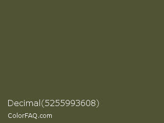 Decimal 5255993608 Color is a dark yellow color and the nearest color is Woodland #4d5328. Hex code #505334 and RGB value is rgb(80,83,52). In RGB color space, this color is composed of 31% red, 33% green, 20% blue, In CMYK color space, this color is composed of 4% cyan, 0% magenta, 37% yellow , 67% black , In HSL color space, this color has a hue angle of 66° , 23% saturation and 26% lightness.