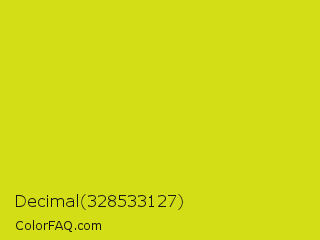 Decimal 328533127 Color is a normal yellow color and the nearest color is Barberry #ded717. Hex code #d4de17 and RGB value is rgb(212,222,23). In RGB color space, this color is composed of 83% red, 87% green, 9% blue, In CMYK color space, this color is composed of 5% cyan, 0% magenta, 90% yellow , 13% black , In HSL color space, this color has a hue angle of 63° , 81% saturation and 48% lightness.
