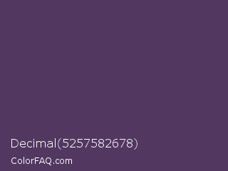 Decimal 5257582678 Color is a dark purple color and the nearest color is English Violet #563c5c. Hex code #523760 and RGB value is rgb(82,55,96). In RGB color space, this color is composed of 32% red, 22% green, 38% blue, In CMYK color space, this color is composed of 15% cyan, 43% magenta, 0% yellow , 62% black , In HSL color space, this color has a hue angle of 280° , 27% saturation and 30% lightness.