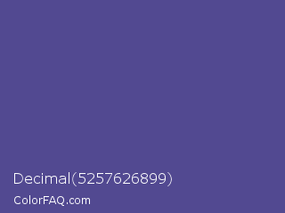 Decimal 5257626899 Color is a normal indigo color and the nearest color is Victoria #534491. Hex code #524991 and RGB value is rgb(82,73,145). In RGB color space, this color is composed of 32% red, 29% green, 57% blue, In CMYK color space, this color is composed of 43% cyan, 50% magenta, 0% yellow , 43% black , In HSL color space, this color has a hue angle of 248° , 33% saturation and 43% lightness.