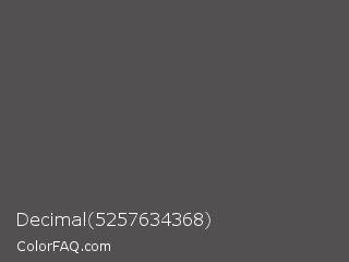Decimal 5257634368 Color is a normal red color and the nearest color is Fuscous Gray #54534d. Hex code #525050 and RGB value is rgb(82,80,80). In RGB color space, this color is composed of 32% red, 31% green, 31% blue, In CMYK color space, this color is composed of 0% cyan, 2% magenta, 2% yellow , 68% black , In HSL color space, this color has a hue angle of 0° , 1% saturation and 32% lightness.