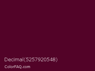 Decimal 5257920548 Color is a very dark rose color and the nearest color is Castro #52001f. Hex code #530328 and RGB value is rgb(83,3,40). In RGB color space, this color is composed of 33% red, 1% green, 16% blue, In CMYK color space, this color is composed of 0% cyan, 96% magenta, 52% yellow , 67% black , In HSL color space, this color has a hue angle of 332° , 93% saturation and 17% lightness.
