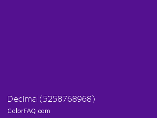 Decimal 5258768968 Color is a normal purple color and the nearest color is Daisy Bush #4f2398. Hex code #541190 and RGB value is rgb(84,17,144). In RGB color space, this color is composed of 33% red, 7% green, 56% blue, In CMYK color space, this color is composed of 42% cyan, 88% magenta, 0% yellow , 44% black , In HSL color space, this color has a hue angle of 272° , 79% saturation and 32% lightness.