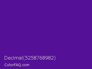 Decimal 5258768982 Color is a normal violet color and the nearest color is Daisy Bush #4f2398. Hex code #541198 and RGB value is rgb(84,17,152). In RGB color space, this color is composed of 33% red, 7% green, 60% blue, In CMYK color space, this color is composed of 45% cyan, 89% magenta, 0% yellow , 40% black , In HSL color space, this color has a hue angle of 270° , 80% saturation and 33% lightness.