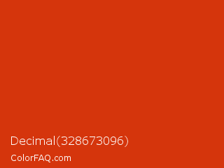 Decimal 328673096 Color is a normal red color and the nearest color is Sinopia #cb410b. Hex code #d5350c and RGB value is rgb(213,53,12). In RGB color space, this color is composed of 84% red, 21% green, 5% blue, In CMYK color space, this color is composed of 0% cyan, 75% magenta, 94% yellow , 16% black , In HSL color space, this color has a hue angle of 12° , 89% saturation and 44% lightness.
