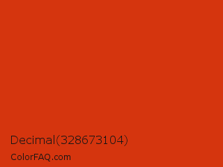 Decimal 328673104 Color is a normal red color and the nearest color is Sinopia #cb410b. Hex code #d5350e and RGB value is rgb(213,53,14). In RGB color space, this color is composed of 84% red, 21% green, 5% blue, In CMYK color space, this color is composed of 0% cyan, 75% magenta, 93% yellow , 16% black , In HSL color space, this color has a hue angle of 12° , 88% saturation and 45% lightness.