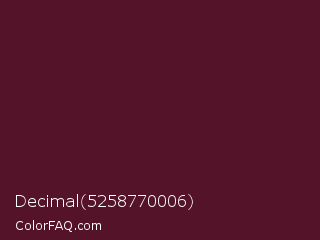 Decimal 5258770006 Color is a very dark rose color and the nearest color is Wine Berry #591d35. Hex code #541328 and RGB value is rgb(84,19,40). In RGB color space, this color is composed of 33% red, 7% green, 16% blue, In CMYK color space, this color is composed of 0% cyan, 77% magenta, 52% yellow , 67% black , In HSL color space, this color has a hue angle of 341° , 63% saturation and 20% lightness.