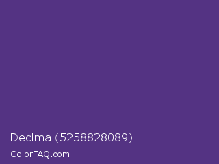 Decimal 5258828089 Color is a normal violet color and the nearest color is Regalia #522d80. Hex code #543383 and RGB value is rgb(84,51,131). In RGB color space, this color is composed of 33% red, 20% green, 51% blue, In CMYK color space, this color is composed of 36% cyan, 61% magenta, 0% yellow , 49% black , In HSL color space, this color has a hue angle of 265° , 44% saturation and 36% lightness.