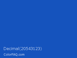 Decimal 20543123 Color is a normal blue color and the nearest color is Sapphire #0f52ba. Hex code #1553bd and RGB value is rgb(21,83,189). In RGB color space, this color is composed of 8% red, 33% green, 74% blue, In CMYK color space, this color is composed of 89% cyan, 56% magenta, 0% yellow , 26% black , In HSL color space, this color has a hue angle of 218° , 80% saturation and 41% lightness.