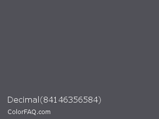 Decimal 84146356584 Color is a normal blue color and the nearest color is Abbey #4c4f56. Hex code #515158 and RGB value is rgb(81,81,88). In RGB color space, this color is composed of 32% red, 32% green, 35% blue, In CMYK color space, this color is composed of 8% cyan, 8% magenta, 0% yellow , 65% black , In HSL color space, this color has a hue angle of 240° , 4% saturation and 33% lightness.
