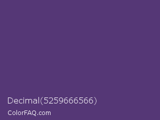 Decimal 5259666566 Color is a normal violet color and the nearest color is Cyber Grape #58427c. Hex code #553776 and RGB value is rgb(85,55,118). In RGB color space, this color is composed of 33% red, 22% green, 46% blue, In CMYK color space, this color is composed of 28% cyan, 53% magenta, 0% yellow , 54% black , In HSL color space, this color has a hue angle of 269° , 36% saturation and 34% lightness.