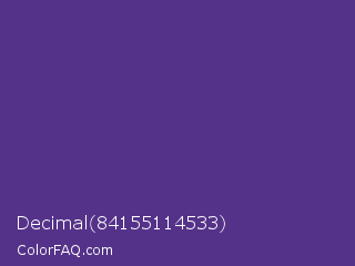 Decimal 84155114533 Color is a normal violet color and the nearest color is Blue Magenta Violet #553592. Hex code #553289 and RGB value is rgb(85,50,137). In RGB color space, this color is composed of 33% red, 20% green, 54% blue, In CMYK color space, this color is composed of 38% cyan, 64% magenta, 0% yellow , 46% black , In HSL color space, this color has a hue angle of 264° , 47% saturation and 37% lightness.