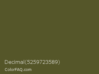Decimal 5259723589 Color is a dark yellow color and the nearest color is Woodland #4d5328. Hex code #555629 and RGB value is rgb(85,86,41). In RGB color space, this color is composed of 33% red, 34% green, 16% blue, In CMYK color space, this color is composed of 1% cyan, 0% magenta, 52% yellow , 66% black , In HSL color space, this color has a hue angle of 61° , 35% saturation and 25% lightness.
