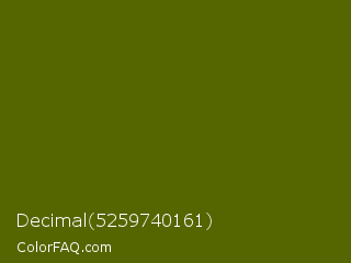 Decimal 5259740161 Color is a very dark yellow color and the nearest color is Saratoga #555b10. Hex code #556601 and RGB value is rgb(85,102,1). In RGB color space, this color is composed of 33% red, 40% green, 0% blue, In CMYK color space, this color is composed of 17% cyan, 0% magenta, 99% yellow , 60% black , In HSL color space, this color has a hue angle of 70° , 98% saturation and 20% lightness.