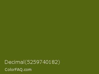 Decimal 5259740182 Color is a dark lime color and the nearest color is Saratoga #555b10. Hex code #556610 and RGB value is rgb(85,102,16). In RGB color space, this color is composed of 33% red, 40% green, 6% blue, In CMYK color space, this color is composed of 17% cyan, 0% magenta, 84% yellow , 60% black , In HSL color space, this color has a hue angle of 72° , 73% saturation and 23% lightness.
