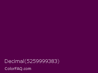 Decimal 5259999383 Color is a very dark magenta color and the nearest color is Pompadour #660045. Hex code #560049 and RGB value is rgb(86,0,73). In RGB color space, this color is composed of 34% red, 0% green, 29% blue, In CMYK color space, this color is composed of 0% cyan, 100% magenta, 15% yellow , 66% black , In HSL color space, this color has a hue angle of 309° , 100% saturation and 17% lightness.