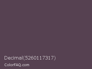 Decimal 5260117317 Color is a dark magenta color and the nearest color is Mortar #504351. Hex code #564151 and RGB value is rgb(86,65,81). In RGB color space, this color is composed of 34% red, 25% green, 32% blue, In CMYK color space, this color is composed of 0% cyan, 24% magenta, 6% yellow , 66% black , In HSL color space, this color has a hue angle of 314° , 14% saturation and 30% lightness.