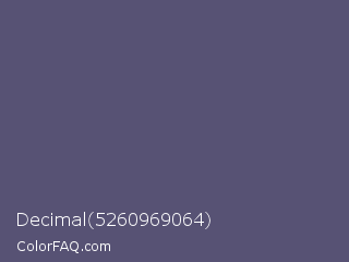Decimal 5260969064 Color is a normal indigo color and the nearest color is Comet #5c5d75. Hex code #575274 and RGB value is rgb(87,82,116). In RGB color space, this color is composed of 34% red, 32% green, 45% blue, In CMYK color space, this color is composed of 25% cyan, 29% magenta, 0% yellow , 55% black , In HSL color space, this color has a hue angle of 249° , 17% saturation and 39% lightness.