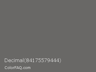 Decimal 84175579444 Color is a normal orange color and the nearest color is Granite Gray #676767. Hex code #696866 and RGB value is rgb(105,104,102). In RGB color space, this color is composed of 41% red, 41% green, 40% blue, In CMYK color space, this color is composed of 0% cyan, 1% magenta, 3% yellow , 59% black , In HSL color space, this color has a hue angle of 40° , 1% saturation and 41% lightness.