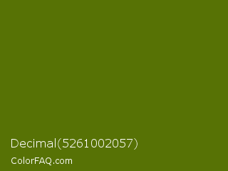 Decimal 5261002057 Color is a dark lime color and the nearest color is Avocado #568203. Hex code #577205 and RGB value is rgb(87,114,5). In RGB color space, this color is composed of 34% red, 45% green, 2% blue, In CMYK color space, this color is composed of 24% cyan, 0% magenta, 96% yellow , 55% black , In HSL color space, this color has a hue angle of 75° , 92% saturation and 23% lightness.