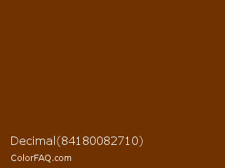 Decimal 84180082710 Color is a very dark orange color and the nearest color is Nutmeg Wood Finish #683600. Hex code #703300 and RGB value is rgb(112,51,0). In RGB color space, this color is composed of 44% red, 20% green, 0% blue, In CMYK color space, this color is composed of 0% cyan, 54% magenta, 100% yellow , 56% black , In HSL color space, this color has a hue angle of 27° , 100% saturation and 22% lightness.
