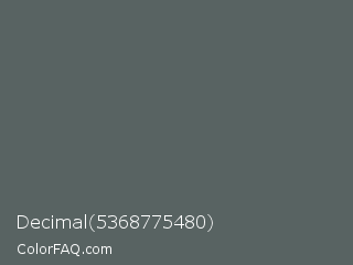 Decimal 5368775480 Color is a normal cyan color and the nearest color is Storm Dust #646463. Hex code #586362 and RGB value is rgb(88,99,98). In RGB color space, this color is composed of 35% red, 39% green, 38% blue, In CMYK color space, this color is composed of 11% cyan, 0% magenta, 1% yellow , 61% black , In HSL color space, this color has a hue angle of 175° , 6% saturation and 37% lightness.