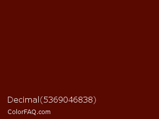 Decimal 5369046838 Color is a very dark red color and the nearest color is Mahogany #4e0606. Hex code #590900 and RGB value is rgb(89,9,0). In RGB color space, this color is composed of 35% red, 4% green, 0% blue, In CMYK color space, this color is composed of 0% cyan, 90% magenta, 100% yellow , 65% black , In HSL color space, this color has a hue angle of 6° , 100% saturation and 17% lightness.