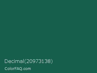 Decimal 20973138 Color is a dark cyan color and the nearest color is Eden #105852. Hex code #155f4c and RGB value is rgb(21,95,76). In RGB color space, this color is composed of 8% red, 37% green, 30% blue, In CMYK color space, this color is composed of 78% cyan, 0% magenta, 20% yellow , 63% black , In HSL color space, this color has a hue angle of 165° , 64% saturation and 23% lightness.