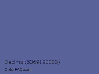 Decimal 5369190003 Color is a normal blue color and the nearest color is UCLA Blue #536895. Hex code #596299 and RGB value is rgb(89,98,153). In RGB color space, this color is composed of 35% red, 38% green, 60% blue, In CMYK color space, this color is composed of 42% cyan, 36% magenta, 0% yellow , 40% black , In HSL color space, this color has a hue angle of 232° , 26% saturation and 47% lightness.