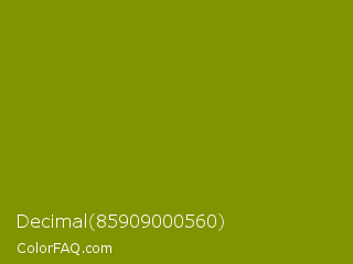Decimal 85909000560 Color is a dark yellow color and the nearest color is Olive #808000. Hex code #809302 and RGB value is rgb(128,147,2). In RGB color space, this color is composed of 50% red, 58% green, 1% blue, In CMYK color space, this color is composed of 13% cyan, 0% magenta, 99% yellow , 42% black , In HSL color space, this color has a hue angle of 68° , 97% saturation and 29% lightness.