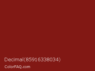 Decimal 85916338034 Color is a dark red color and the nearest color is Falu Red #801818. Hex code #821814 and RGB value is rgb(130,24,20). In RGB color space, this color is composed of 51% red, 9% green, 8% blue, In CMYK color space, this color is composed of 0% cyan, 82% magenta, 85% yellow , 49% black , In HSL color space, this color has a hue angle of 2° , 73% saturation and 29% lightness.