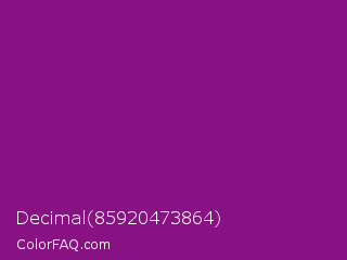 Decimal 85920473864 Color is a dark magenta color and the nearest color is Mardi Gras #880085. Hex code #881184 and RGB value is rgb(136,17,132). In RGB color space, this color is composed of 53% red, 7% green, 52% blue, In CMYK color space, this color is composed of 0% cyan, 88% magenta, 3% yellow , 47% black , In HSL color space, this color has a hue angle of 302° , 78% saturation and 30% lightness.
