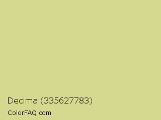 Decimal 335627783 Color is a light yellow color and the nearest color is Deco #d2da97. Hex code #d5d88f and RGB value is rgb(213,216,143). In RGB color space, this color is composed of 84% red, 85% green, 56% blue, In CMYK color space, this color is composed of 1% cyan, 0% magenta, 34% yellow , 15% black , In HSL color space, this color has a hue angle of 62° , 48% saturation and 70% lightness.