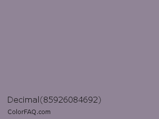 Decimal 85926084692 Color is a normal purple color and the nearest color is Venus #928590. Hex code #908496 and RGB value is rgb(144,132,150). In RGB color space, this color is composed of 56% red, 52% green, 59% blue, In CMYK color space, this color is composed of 4% cyan, 12% magenta, 0% yellow , 41% black , In HSL color space, this color has a hue angle of 280° , 8% saturation and 55% lightness.
