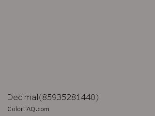Decimal 85935281440 Color is a normal color and the nearest color is Mountain Mist #959396. Hex code #949190 and RGB value is rgb(148,145,144). In RGB color space, this color is composed of 58% red, 57% green, 56% blue, In CMYK color space, this color is composed of 0% cyan, 2% magenta, 3% yellow , 42% black , In HSL color space, this color has a hue angle of 15° , 2% saturation and 57% lightness.