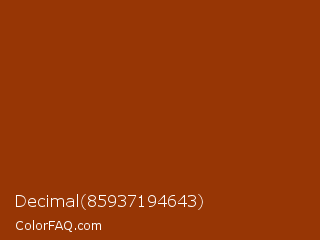 Decimal 85937194643 Color is a normal orange color and the nearest color is Oregon #9b4703. Hex code #973605 and RGB value is rgb(151,54,5). In RGB color space, this color is composed of 59% red, 21% green, 2% blue, In CMYK color space, this color is composed of 0% cyan, 64% magenta, 97% yellow , 41% black , In HSL color space, this color has a hue angle of 20° , 94% saturation and 31% lightness.