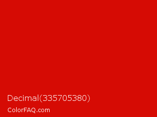 Decimal 335705380 Color is a normal red color and the nearest color is Rosso Corsa #d40000. Hex code #d60b04 and RGB value is rgb(214,11,4). In RGB color space, this color is composed of 84% red, 4% green, 2% blue, In CMYK color space, this color is composed of 0% cyan, 95% magenta, 98% yellow , 16% black , In HSL color space, this color has a hue angle of 2° , 96% saturation and 43% lightness.