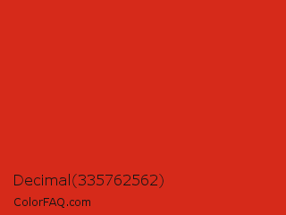 Decimal 335762562 Color is a normal red color and the nearest color is Maximum Red #d92121. Hex code #d62a1a and RGB value is rgb(214,42,26). In RGB color space, this color is composed of 84% red, 16% green, 10% blue, In CMYK color space, this color is composed of 0% cyan, 80% magenta, 88% yellow , 16% black , In HSL color space, this color has a hue angle of 5° , 78% saturation and 47% lightness.