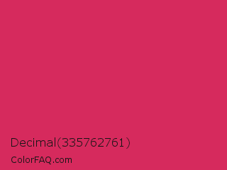 Decimal 335762761 Color is a normal rose color and the nearest color is Cerise Red #de3163. Hex code #d62a5d and RGB value is rgb(214,42,93). In RGB color space, this color is composed of 84% red, 16% green, 36% blue, In CMYK color space, this color is composed of 0% cyan, 80% magenta, 57% yellow , 16% black , In HSL color space, this color has a hue angle of 342° , 68% saturation and 50% lightness.