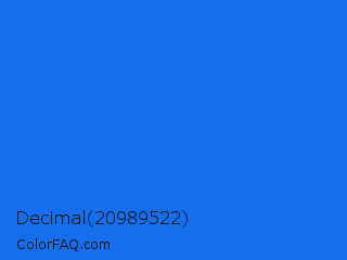 Decimal 20989522 Color is a normal blue color and the nearest color is Blue Crayola #1f75fe. Hex code #156eec and RGB value is rgb(21,110,236). In RGB color space, this color is composed of 8% red, 43% green, 93% blue, In CMYK color space, this color is composed of 91% cyan, 53% magenta, 0% yellow , 7% black , In HSL color space, this color has a hue angle of 215° , 85% saturation and 50% lightness.