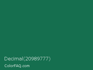 Decimal 20989777 Color is a dark green color and the nearest color is Dark Spring Green #177245. Hex code #156f4f and RGB value is rgb(21,111,79). In RGB color space, this color is composed of 8% red, 44% green, 31% blue, In CMYK color space, this color is composed of 81% cyan, 0% magenta, 29% yellow , 56% black , In HSL color space, this color has a hue angle of 159° , 68% saturation and 26% lightness.