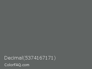Decimal 5374167171 Color is a normal cyan color and the nearest color is Storm Dust #646463. Hex code #606463 and RGB value is rgb(96,100,99). In RGB color space, this color is composed of 38% red, 39% green, 39% blue, In CMYK color space, this color is composed of 4% cyan, 0% magenta, 1% yellow , 61% black , In HSL color space, this color has a hue angle of 165° , 2% saturation and 38% lightness.