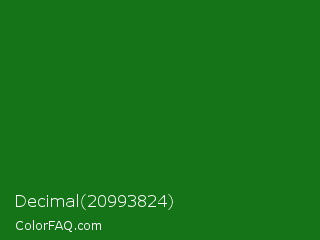 Decimal 20993824 Color is a dark green color and the nearest color is Japanese Laurel #0a6906. Hex code #157318 and RGB value is rgb(21,115,24). In RGB color space, this color is composed of 8% red, 45% green, 9% blue, In CMYK color space, this color is composed of 82% cyan, 0% magenta, 79% yellow , 55% black , In HSL color space, this color has a hue angle of 122° , 69% saturation and 27% lightness.