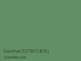 Decimal 5375071876 Color is a normal green color and the nearest color is Russian Green #679267. Hex code #619064 and RGB value is rgb(97,144,100). In RGB color space, this color is composed of 38% red, 56% green, 39% blue, In CMYK color space, this color is composed of 33% cyan, 0% magenta, 31% yellow , 44% black , In HSL color space, this color has a hue angle of 124° , 20% saturation and 47% lightness.