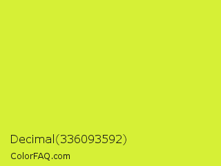Decimal 336093592 Color is a normal yellow color and the nearest color is Pear #d1e231. Hex code #d6f036 and RGB value is rgb(214,240,54). In RGB color space, this color is composed of 84% red, 94% green, 21% blue, In CMYK color space, this color is composed of 11% cyan, 0% magenta, 78% yellow , 6% black , In HSL color space, this color has a hue angle of 68° , 86% saturation and 58% lightness.