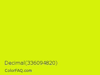 Decimal 336094820 Color is a normal yellow color and the nearest color is Volt #ceff00. Hex code #d6f208 and RGB value is rgb(214,242,8). In RGB color space, this color is composed of 84% red, 95% green, 3% blue, In CMYK color space, this color is composed of 12% cyan, 0% magenta, 97% yellow , 5% black , In HSL color space, this color has a hue angle of 67° , 94% saturation and 49% lightness.
