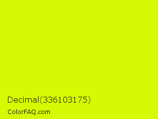 Decimal 336103175 Color is a normal yellow color and the nearest color is Volt #ceff00. Hex code #d6fa03 and RGB value is rgb(214,250,3). In RGB color space, this color is composed of 84% red, 98% green, 1% blue, In CMYK color space, this color is composed of 14% cyan, 0% magenta, 99% yellow , 2% black , In HSL color space, this color has a hue angle of 69° , 98% saturation and 50% lightness.