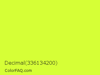Decimal 336134200 Color is a light lime color and the nearest color is Starship #ecf245. Hex code #d6ff36 and RGB value is rgb(214,255,54). In RGB color space, this color is composed of 84% red, 100% green, 21% blue, In CMYK color space, this color is composed of 16% cyan, 0% magenta, 79% yellow , 0% black , In HSL color space, this color has a hue angle of 72° , 100% saturation and 61% lightness.