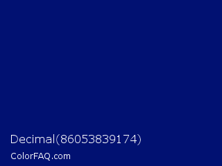 Decimal 86053839174 Color is a dark blue color and the nearest color is Dark Imperial Blue #00147e. Hex code #011172 and RGB value is rgb(1,17,114). In RGB color space, this color is composed of 0% red, 7% green, 45% blue, In CMYK color space, this color is composed of 99% cyan, 85% magenta, 0% yellow , 55% black , In HSL color space, this color has a hue angle of 232° , 98% saturation and 23% lightness.