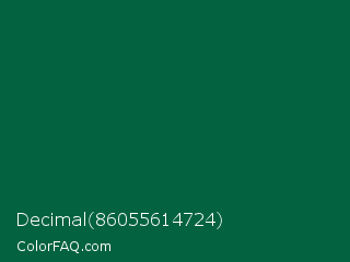 Decimal 86055614724 Color is a very dark green color and the nearest color is Cadmium Green #006b3c. Hex code #036240 and RGB value is rgb(3,98,64). In RGB color space, this color is composed of 1% red, 38% green, 25% blue, In CMYK color space, this color is composed of 97% cyan, 0% magenta, 35% yellow , 62% black , In HSL color space, this color has a hue angle of 159° , 94% saturation and 20% lightness.